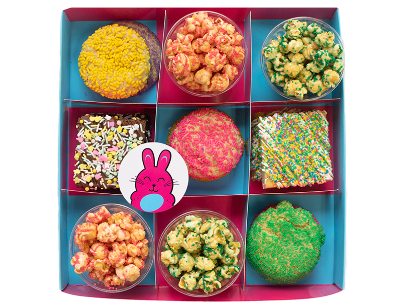 This delicious Easter Baked Gift Box is a festive themed box of treats, perfect for your friends, family and loved ones. This treat box is available in the confectioner's or jumbo sizes.