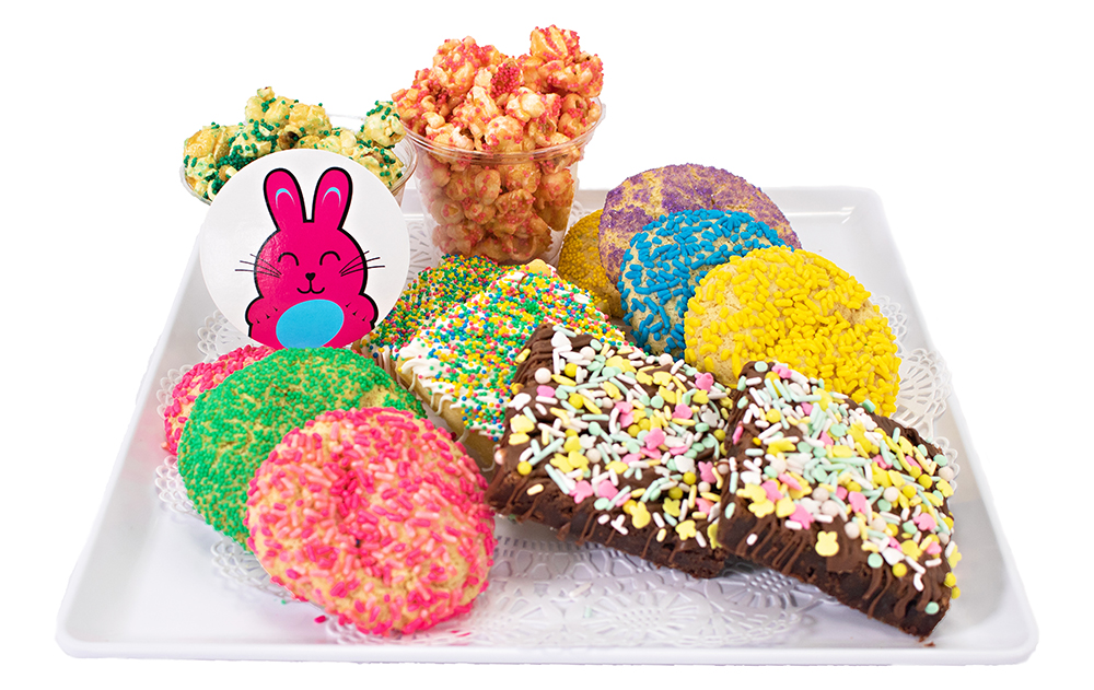 - 3 Sugar Cookies – Our simple but yet so yummy buttery sugar cookie is all scooped up in balls and then takes a dive into the wonderful world of Confetti Confections colored sparkle sugars.