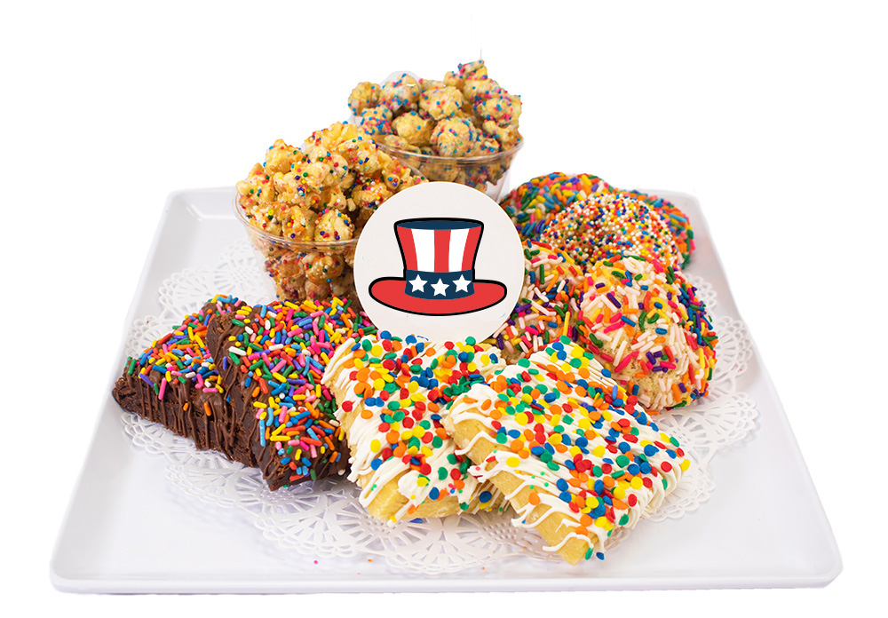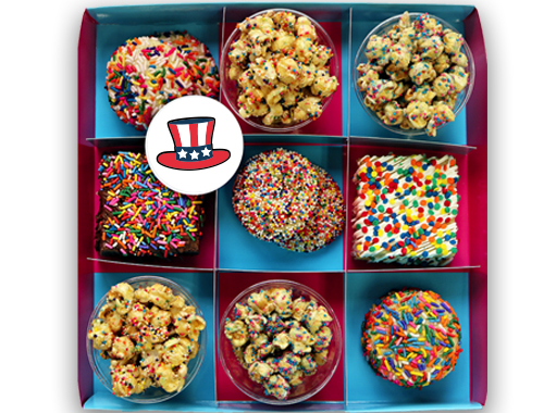 • 3 Sugar Cookies – Our simple but yet so yummy buttery sugar cookie is all scooped up in balls and then takes a dive into the wonderful world of Confetti Confections colored sparkle sugars.