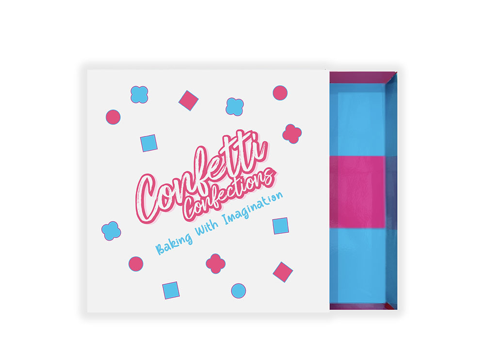 Confetti Confections always bakes from scratch and with only fresh ingredients. Each box weighs approximately 4lbs, measuring 12 X 12 X 2″ and ships in a protected design box. Each gift box has a slide out tray to bring wonder & fun!
